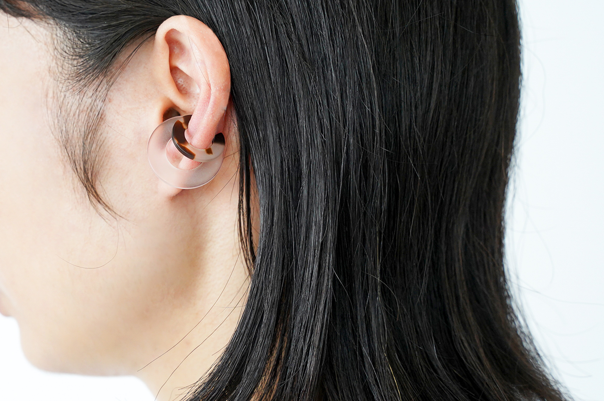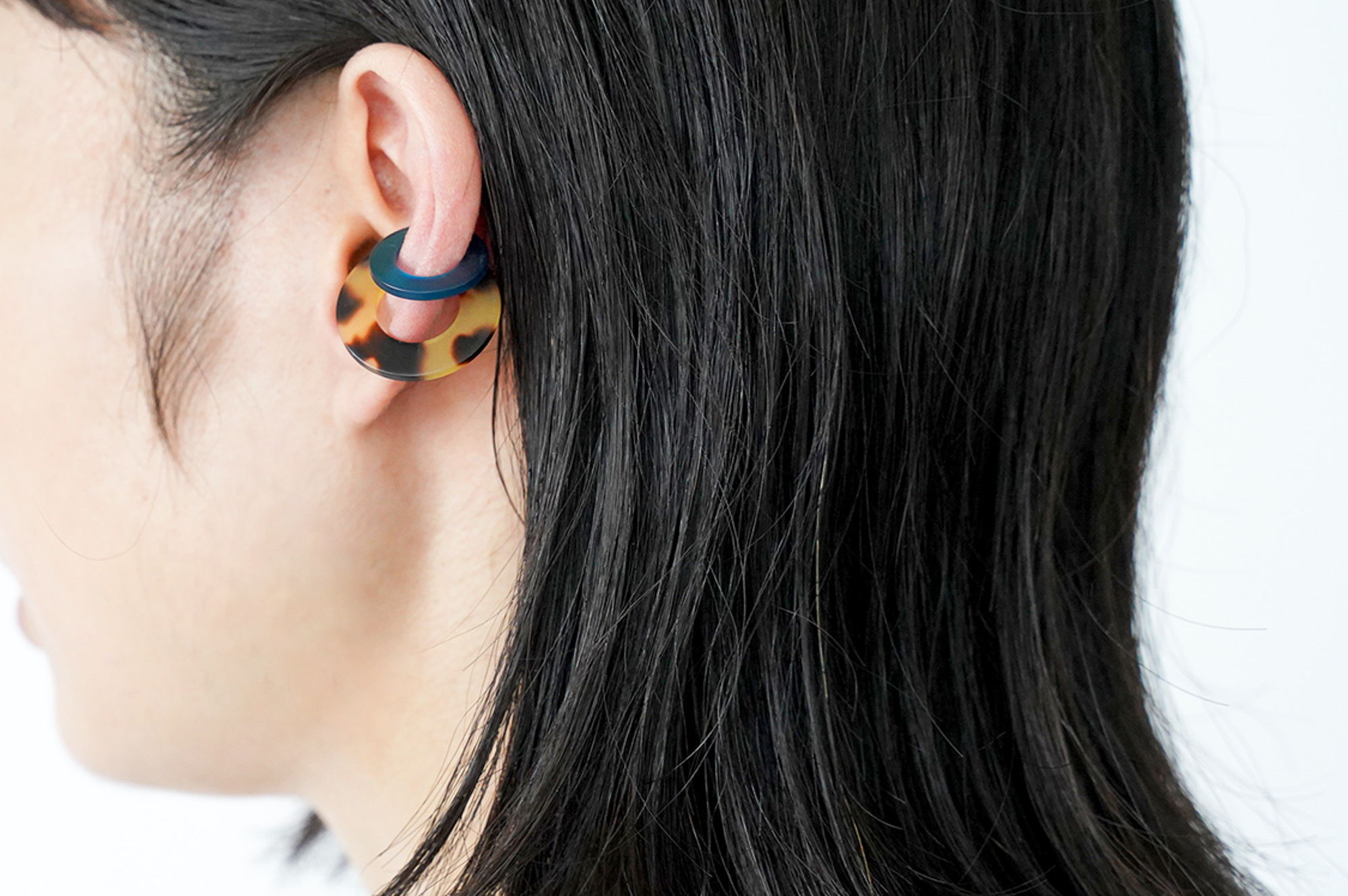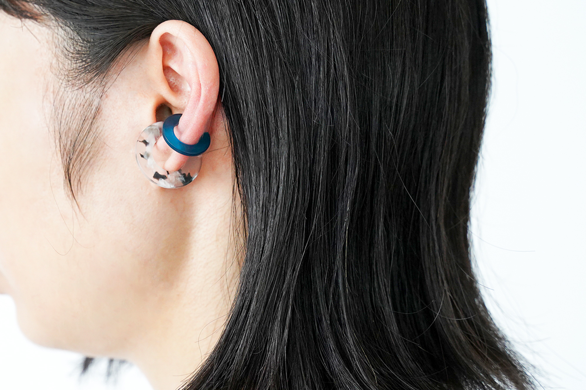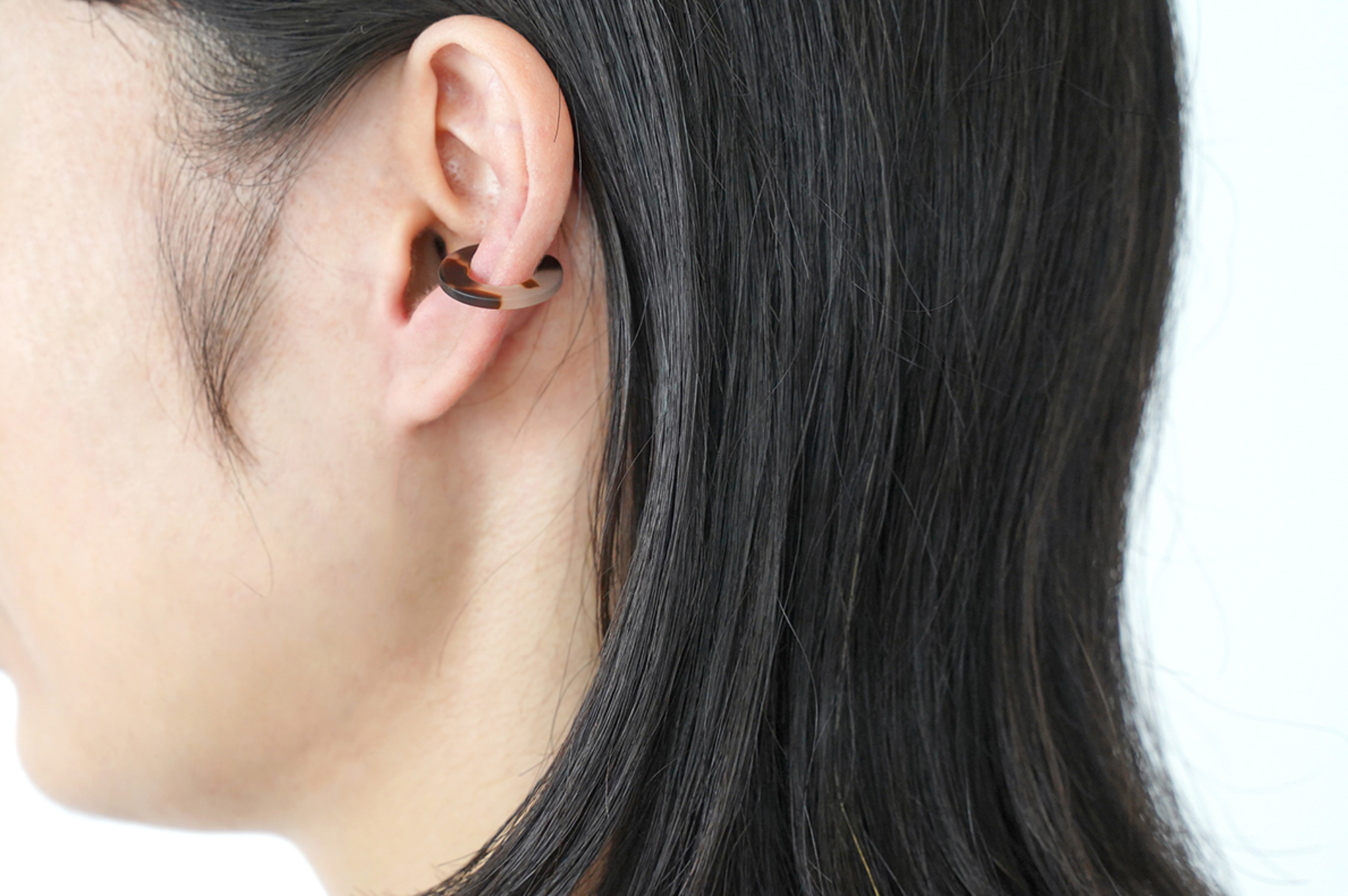 さらに、Surのイヤーカフはめがねフレームの素材でもある「セルロースアセテート」という綿花由来の植物性の樹脂でできており、石油系のプラスチックよりも柔らかい素材感で、軽く肌にそっと馴染みます。