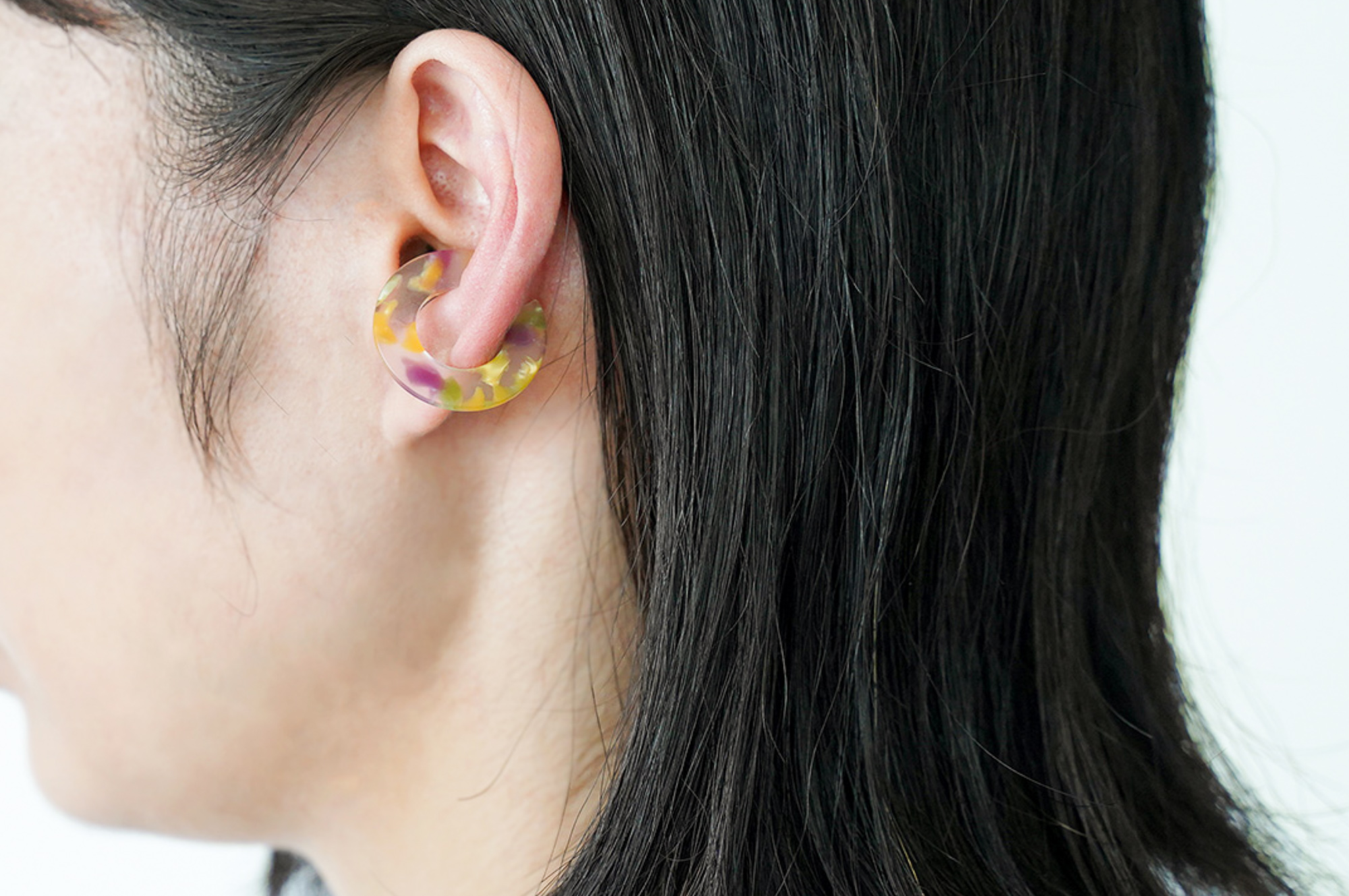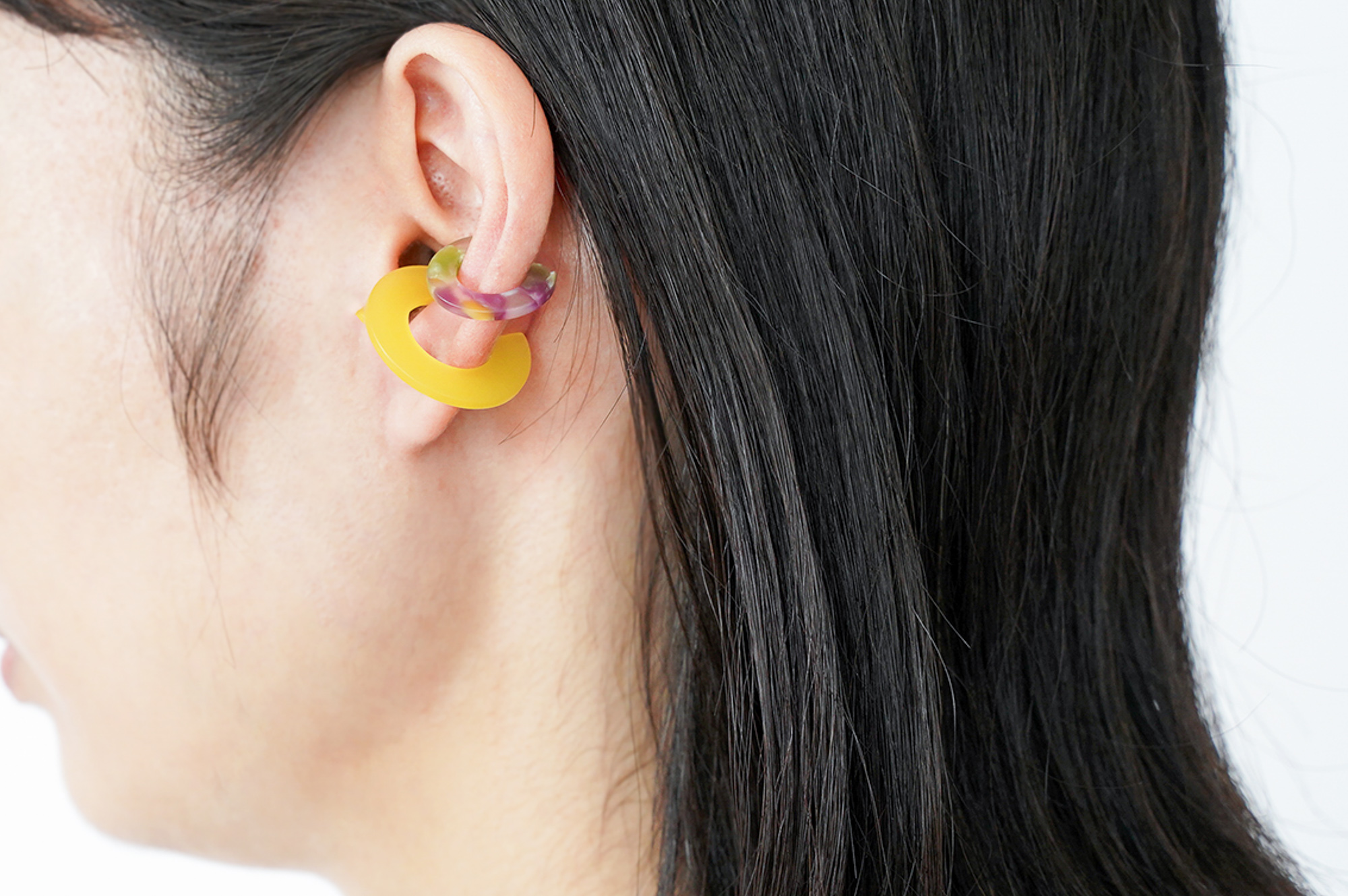 また、世の中にイヤーカフはすでにたくさんあるけれど、眼鏡のフレームに使用されるアセテートを使い、色鮮やか且つ透明感のあるSurらしいイヤーカフを提案できたらいいなと思いました。